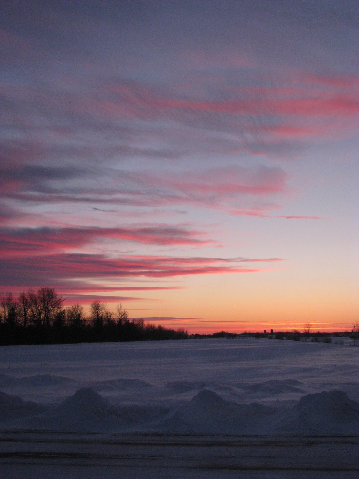 Absolutely fabulous. The peaks of snow in the forefront are man-made. The city comes by with their big snow plow and blows the snow into the field across the street. Given the windy conditions, our road would become narrower and narrower with each passing hour. It basically buys the snow-plow operator a bit of time between his rounds.